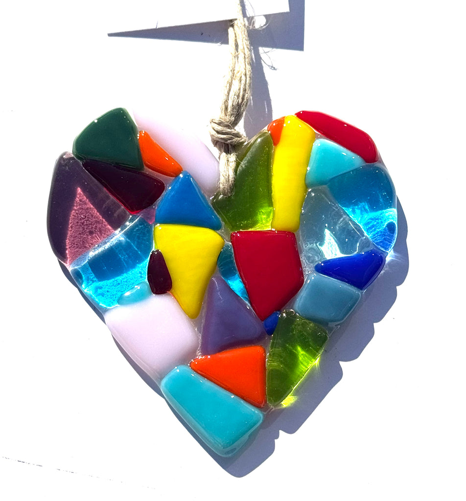 This 3x4” rainbow fused glass suncatcher will bring light to anyone! Colorful and fun, it’s a great reminder to spread cheer! Each piece is hand cut and placed by Cheryl